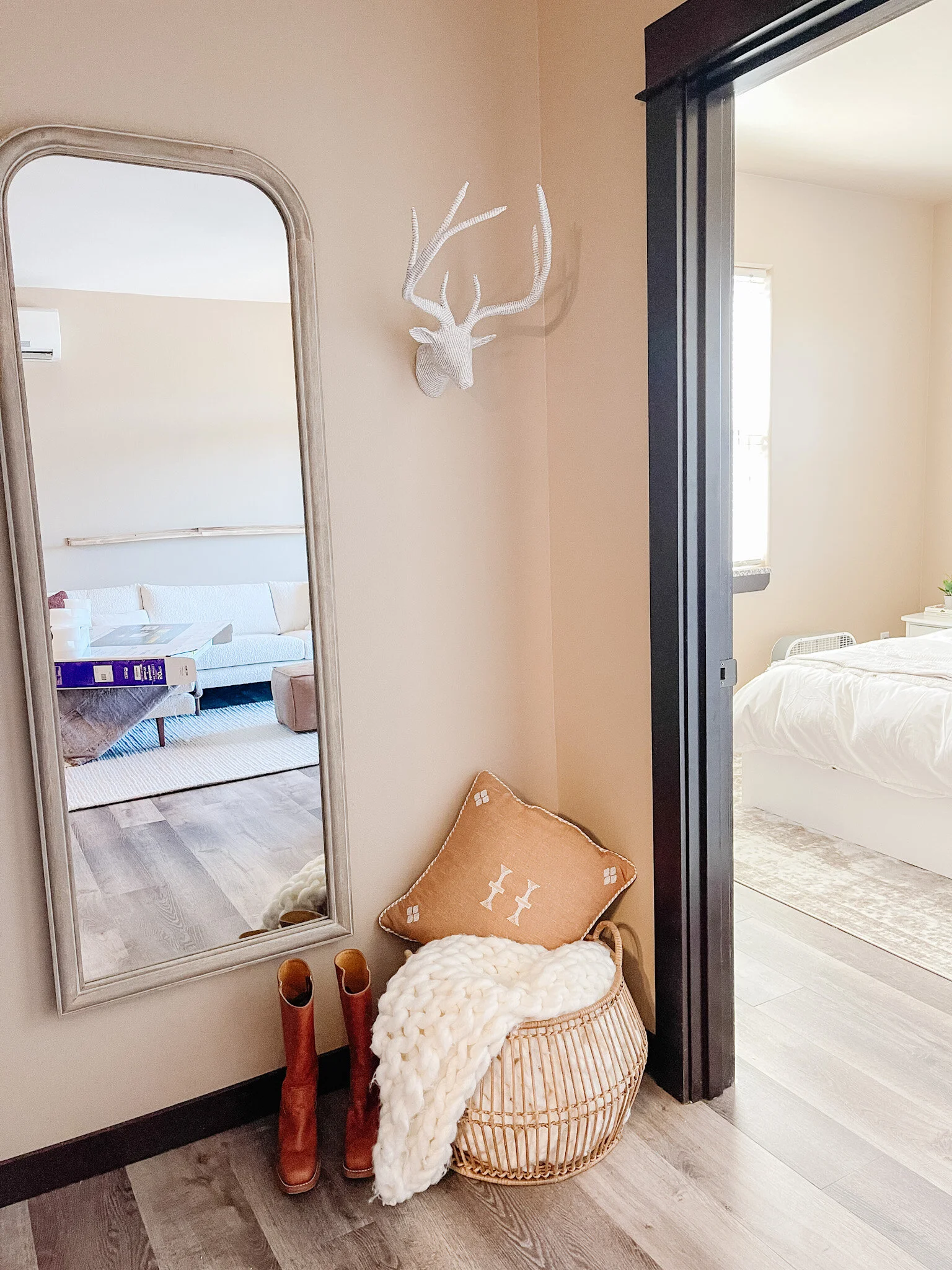 This little hallway had the awesome electrical box that every home builder loves to put in plain sight. We chose to hang a long mirror here to make the space feel larger and hide this ugly box.